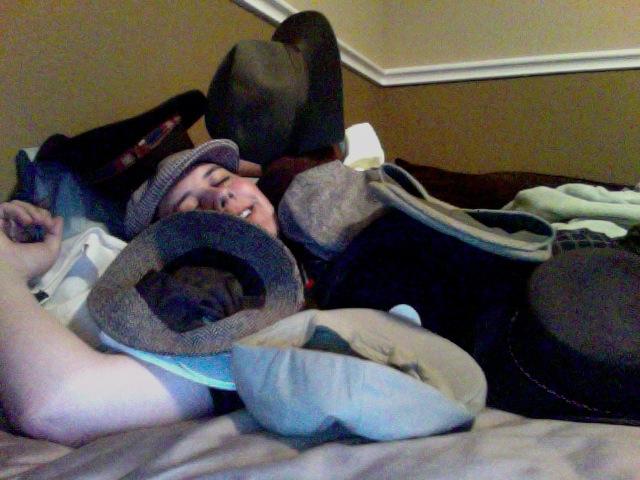 Ah..... I do love all my hats... I don't think this fully shows my obsession, but I know I have at least a quarter of my hats with me in this pic. Of course this picture is like 2 years old I think so of course my hat collection has grown.