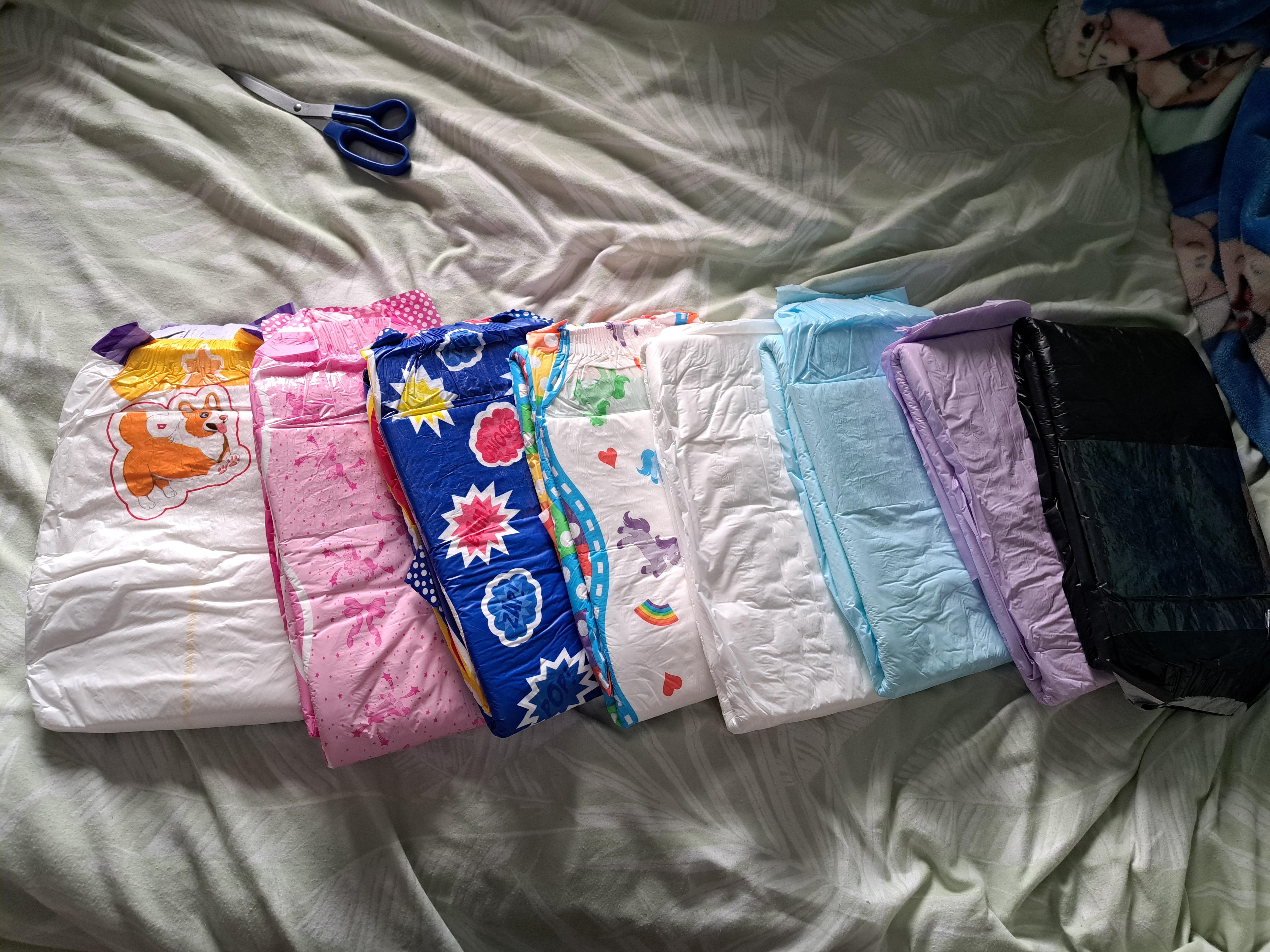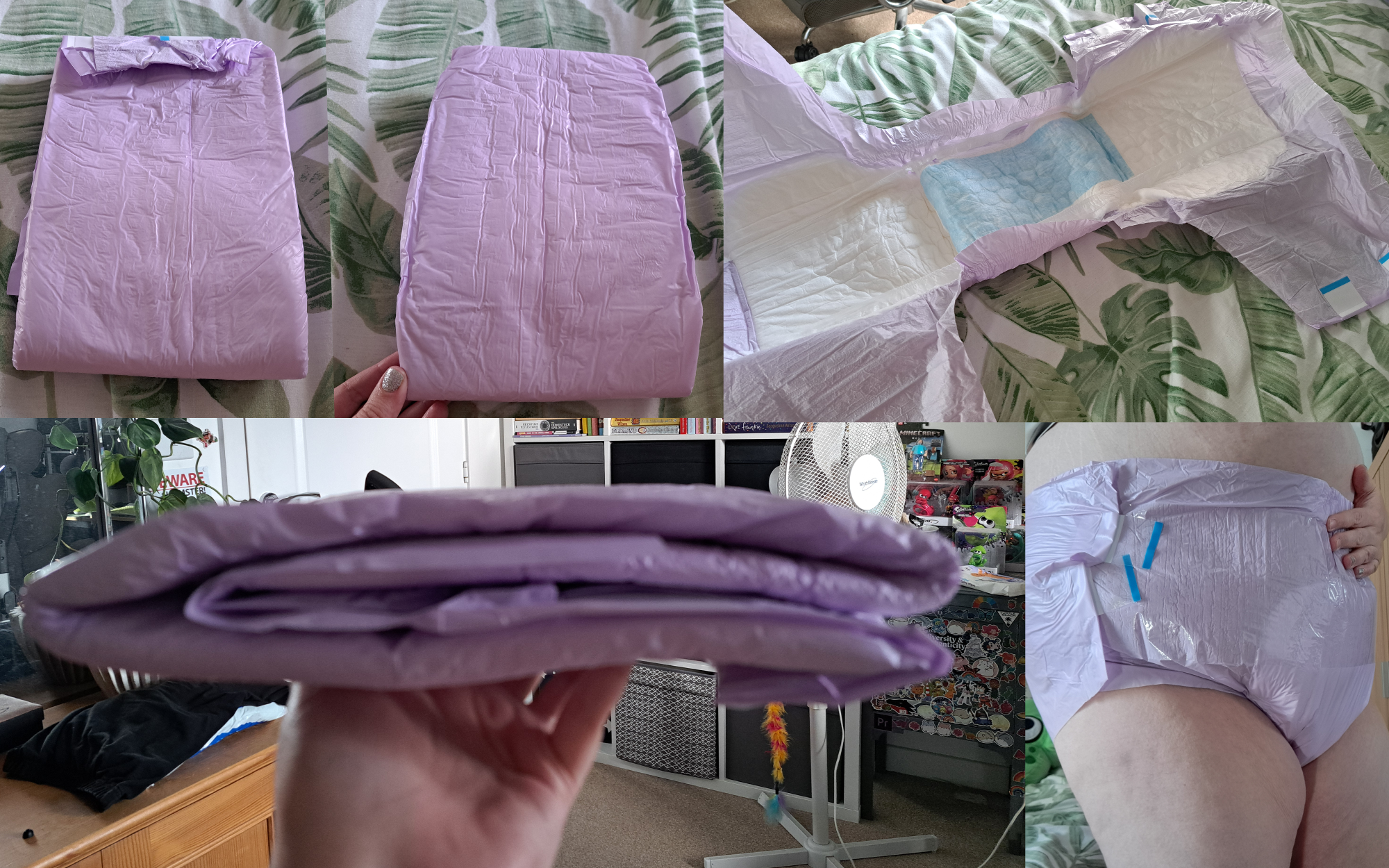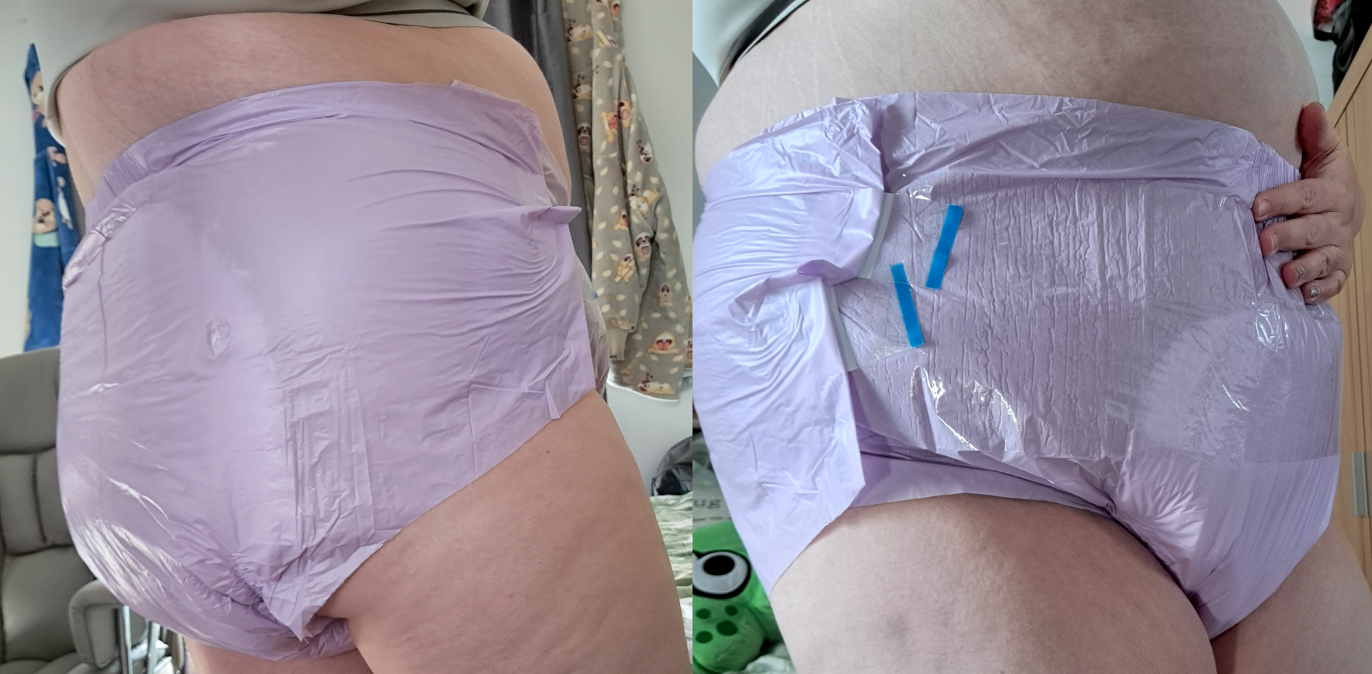 This is my first time making one of these, any feedback or questions for information i've missed I'll be happy to answer to the best of my ability. If you are interested in trying these diapers for yourself, this is their website. https://www.thedottydiapercompany.co.uk/ In advance I will warn that the following is my personal experience and perspective of these diapers and I despite what I say, I encourage you to try these if you feel like doing so to formulate your own perspective of them. What appeals to you and I may vary entirely, so simply take what I say with a pinch of salt if possible. I ordered a sample pack from Dotty Diapers recently because they've been on my radar for a while, Ive heard good things from other UK based users and the designs have always been appealing to me. I actually had an older dotty diaper in my collection (from before 2019) which I hadn't realized was a dotty diaper until the sample pack arrived. In particular I've experienced previously the rainbow pony diaper from another sample pack I've acquired in the past, so i was surprised to see it again included here, however, as I had recently tried out the diaper, this turned into more of a comparative review between current and old versions of the diaper. Unfortunately I don't have pictures of the pre-2019 rainbow pony diaper, so you'll just have to take my words as they are for now. Apologies! The diaper I previously tried was from around 2020-2019, at least as far as I'm aware it was around that time. The first thing I noticed when I received the current-day editions of these diapers is that they are at least half the thickness as they were 4 years ago. I have included pictures of specifically the Purple dotty diaper, though I am under the impression that most of these are similar in function with the main variance being in the aesthetics. I initially anticipated these diapers being higher quality than they currently are, especially compared to the diaper I owned previously. I imagine this is likely due to the shrinkflation phenomenon that is currently plaguing our country, As dotty diapers is a small business I must state it is not my intent to criticize business practices or alienate anybody against the owners, I'm merely giving my view and opinion on the quality of the products I have received. It is very likely these decisions in regard to the decline in quality were to maintain the products value, and despite what else I may say later in the review, I still consider them a valuable product for anybody experimenting with more aesthetically pleasing diapers. So far specifically, I have tried the playful pups (£18.99 for 10) which I wore over an evening, night and morning, and the plain and simple purple diaper (£17.99 for 10) Both in size XL as I have a large tummy. Below I have compiled a collection of images of the purple diaper, Unfortunately I wasn't able to get a picture of the playful pups diaper, but I will attach an image for reference later in the review. Pictured Below: A plain and simple Purple Dotty Diaper, top, beneath, open, side view and worn on a plus size female body. The following is in regards to my experiences with both the Plain and Simple Purple diaper (which I will refer to as Purple Diaper for ease from this point forward) I changed into this diaper in the morning-to mid-day time and wore this under a pair of boy-shorts underwear and cycling shorts (short leggings). I am personally not usually a fan of plastic backed diapers but was pleasantly surprised by these in particular as the plastic backing on it is surprisingly soft and flexible. It is still somewhat crinkly and did make me feel quite warm through-out the day, this is interesting as the website claims the diaper is made with 'breathable plastic'. I am disabled and spend a lot of time inside, so this review is from a user who is mostly sedentary. I probably wore this diaper for about 6-8 hours before I essentially 'gave up' with it due to discomfort. I am not a fan of the sound that plastic backed diapers make as I prefer discretion, for me, this is an okay diaper to wear around the home, for a play session, or by fans of this crinkly sound. I found this diaper leaked quite quickly, though I imagine this may have been due to my own failure with the tapes. Speaking of the tapes, despite the drop in quality I noticed with this diaper over all compared to older dotty diapers I've tried, the tapes remain to be some of the highest quality adhesive tapes ive experienced on a diaper. These are THICK, extremely wide, but once they are stuck down, you are not getting them off again in a hurry. To my surprise these tapes held strong for most of the day, a problem I often have with my awkward shaped body is diapers with tapes that stretch and lose their grip as the day progresses, leading to a nappy that wont stay in place, because of this I usually wear diaper covers or pants over the diaper to help keep it up and on, but I probably could have sufficed with just the diaper itself. This is one element of the diaper that gets 10/10 for me. Back to the leaking issue. This diaper was barely full by the time I had to throw in the towel, it probably leaked on me 3 hours into the wear, keeping in mind I am sedentary and spend a lot of time sitting down, I almost always experience leaks in the inner leg area, considering this is a common occurrence for me, I do not exactly want to blame the diaper itself but I will say compared to other diapers these have an awkward fit on the size and shape of my body, even with a cover, it felt loose against my backside which is where the majority of these leaks formed this time in particular. These diapers claim to hold 6000ml, I don't believe I was anywhere near this capacity when the leak occurred. Regarding design and aesthetics, these are PURPLE. and I love purple, I do love the concept of plain diapers as a person who regularly uses medical slips, the medical ones always have this distracting im