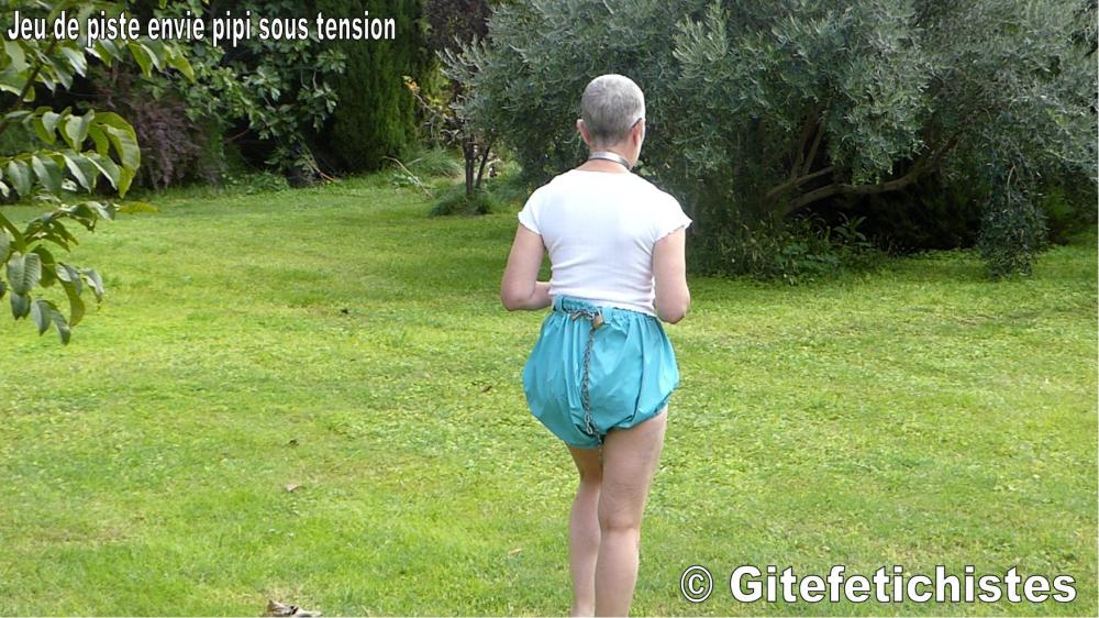 An Espace Game is a kind of treasure hunt where you have to find clues to free yourself from handcuffs, a butt plug or other restraints, or to be able to remove your nappy or go to the toilet. I really enjoy organising them for our friends or members of our association (a non-profit organisation). Simply attach a chain and padlock to the waistband of a pair of trousers. Then hide the clues that the person has to find. You can do it yourself in the great outdoors, taking care to ensure that your nappy (or other restraints) cannot be seen. The aim of the game is not to shock people. In this photo, taken at our home and published WITH permission! They were linked together by a chain around their ankles. They wore chain collars (safe) and handcuffs so that they couldn't touch their diapers but could protect themselves if they fell. The game was played on our property.