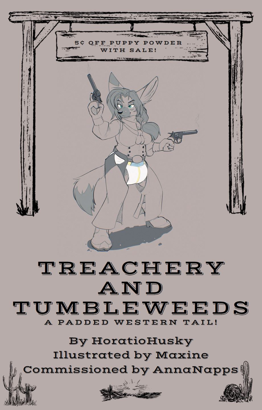 Treachery and Tumbleweeds By Horatio Husky Commissioned by AnnaNapps Chapter One The Gulch The morning sun spilled across Brass Gulch, painting the bustling frontier town in shades of gold and copper. The air carried a faint metallic tang from the network of steam pipes crisscrossing the buildings, their occasional hisses and puffs a constant reminder of the town’s industrious, steampunk soul. Wooden sidewalks creaked underfoot as residents and travelers hurried about their business, and wagon wheels clattered over cobblestone streets. Above it all, the Brass Fountain gushed a glittering arc of water into the air, its spray catching the light like tiny jewels. Though the town’s residents knew not to drink from it, the occasional traveler might be convinced to take a few sips from the fresh flowing water as a mark of good luck, only to find themselves waddling around babbling nonsense only a few minutes later as the tinged contents reduced their limbs and thoughts to that of one much more docile and giddy. The town was alive with the clamor of commerce. Merchants shouted over the din, their stalls overflowing with goods ranging from exotic fabrics to intricate clockwork trinkets. A blacksmith’s hammer rang out from a nearby forge, the rhythmic clang melding with the lively chatter of townsfolk. Urchins darted through the square, their laughter weaving through the chaos as they played tag around the towering fountain. At the center of it all, Sparky, the sheriff of Brass Gulch, walked with an air of quiet authority. She was a fennec fox, her sandy-colored fur shining in the morning light, her enormous ears twitching as she picked up snippets of conversation from all directions. Dressed in a sleeveless leather vest over a crisp white shirt, a turquoise tie neatly knotted at her throat, and leather chaps that framed the front and back of her thick, plainly visible diaper, she struck a striking figure. The attire, bold even by the town’s standards, was both practical and declarative: Sparky was proud, unflinching, and entirely in control. She adjusted her wide-brimmed hat and continued her patrol, the polished brass of her badge catching the sunlight. Her boots clunked rhythmically against the wooden planks, and her sharp eyes scanned the street for signs of trouble. Sparky knew the rhythms of Brass Gulch well, knew how to read its moods like a familiar tune, and something about this morning felt off. Not wrong, exactly, but a little off. Her instincts had been honed over years of keeping order in this chaotic, ever-growing town, and she trusted them implicitly. Ahead, the Brass Gulch Jailhouse loomed, its sturdy walls built of dark ironwood reinforced with brass-plated steel. A pair of copper steam vents flanked the entrance, hissing softly as Sparky pushed through the heavy door. Inside, the familiar scent of polished metal and faint lavender greeted her. The cells were unorthodox for a jail, each equipped with padded cribs instead of bunks, their occupants given basic comforts alongside the occasional meal laced with just enough regression water to keep them placid. Most detainees left as humbled as they were clean, though some were denied changes to let their new situation properly set in. Behind the desk sat Griggs, her deputy, a massive grizzly bear whose imposing size was matched only by his gentle demeanor. He was hunched over a ledger, his clawed fingers scratching notes in neat rows. “Mornin’, Sheriff.” Griggs rumbled without looking up. His voice was deep and steady, as dependable as the man himself. “New one in Cell Three. Caught him swipin’ gears from the clockmaker’s shop.” Sparky raised an eyebrow as she walked to the desk, her ears flicking toward the cells down the hall. “Gears, huh? Not the most creative heist I’ve heard of. What’s his story?” Griggs looked up, his warm brown eyes meeting hers. “Young raccoon. Cocky. Says he was ‘borrowing.’” Sparky’s lips twitched in the faintest hint of a smirk. “Let me guess… He didn’t have a return date in mind.” “Nope.” Griggs replied with a soft chuckle. “But I’ll let you hear it from him.” Sparky nodded and made her way to the back of the jailhouse, her boots clinking softly against the polished stone floor. The cells were mostly empty, save for Cell Three, where a wiry raccoon lounged in a padded crib like it was a throne. His striped tail flicked lazily causing the rather soggy diaper affixed to his waist to crinkle distinctly, and his sharp eyes gleamed with amusement as he saw her approach. “Well, if it ain’t the sheriff herself.” He drawled, a sly grin spreading across his face as his tone shifted to a higher pitch. “Come to tuck me in?” “Not unless you ask nicely.” Sparky replied dryly, crossing her arms. “Got quite the nerve, stealing from the clockmaker.” “Stealing’s a strong word.” The raccoon replied smoothly, his diction surprisingly clear given the dose of regression water he should have been under the effects of. Sitting up, he spread his dark paws in mock innocence. “I was jus’ borrowin’. Didn’ think them gears were such a big deal.” “Everything’s a big deal when it belongs to someone else.” Sparky shot back, her tone firm but calm. “You’ll have time to think about that while you’re here.” The raccoon’s grin didn’t falter, but his tail flicked a little faster as he drew a pastel blue blanket over himself. “Well, I guess I’ll just make myself at home then, Sheriff. Thanks for the hospitality.” Sparky didn’t respond, turning on her heel and heading back to the front desk. “He’s too relaxed for his own good.” She muttered to Griggs. “Keep an eye on him. Double his dose” “Already have.” Griggs replied with a tone of exasperation barely concealed in his grumble. His large, heavy paws steady on the desk as he continued. “Not sure if triplin’ or quadruplin’ the dose is a good idea either. He