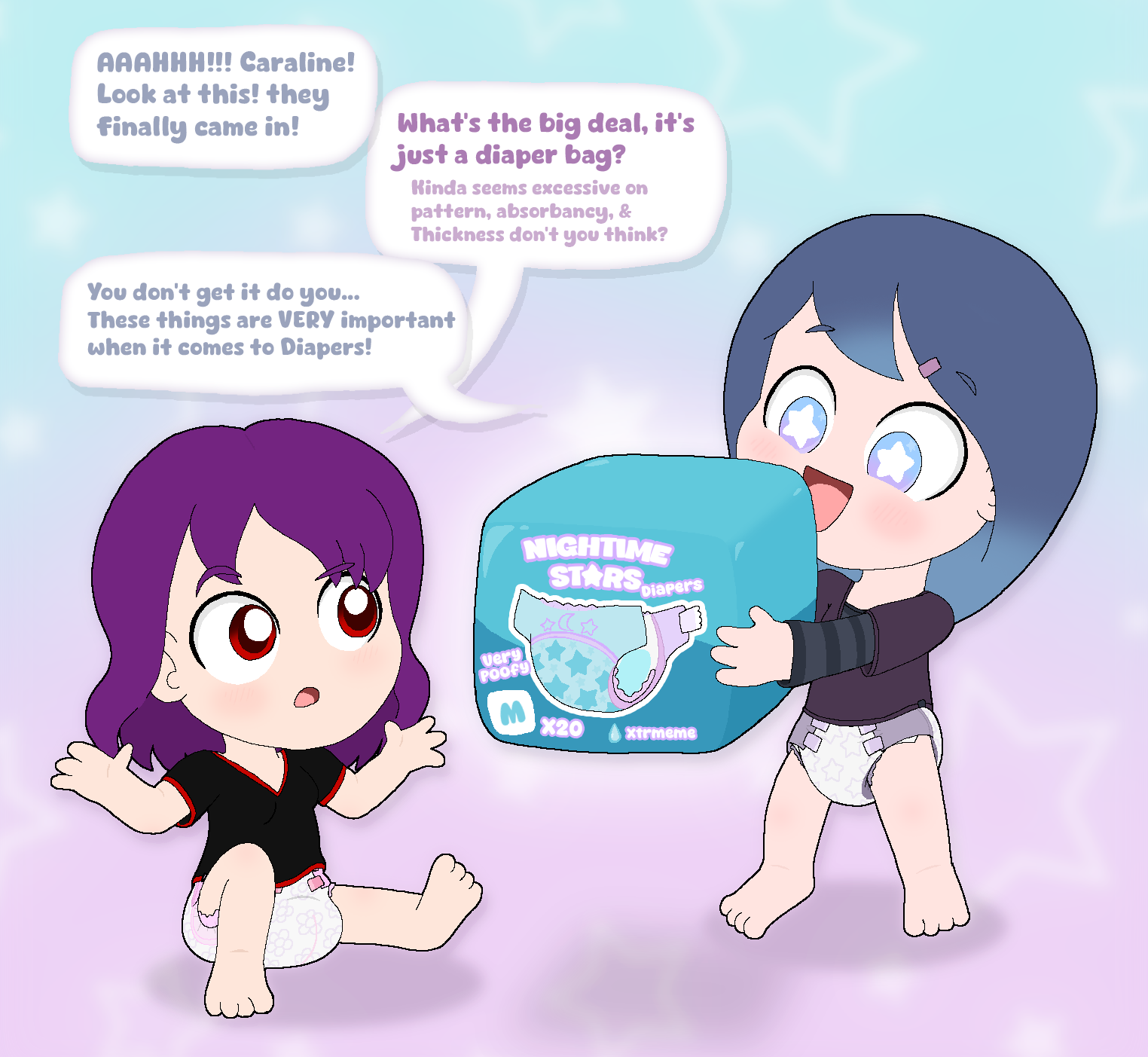 Just thought I’d share some diaper Arts I’ve drawn (these characters are OCs of mine) abdl art is the minority of the art I draw tho. Usually if it’s a non baby/toddler diaper arts will be in scraps section instead. https://www.deviantart.com/rotommowtom/gallery?q=Diaper (Caraline and Angeline) (Angeline morning) (random diaper girl in Alphagatorz) Princess dieanna and her twins (Kyra & wrektor) (Clare and Iris, Iris holding starline “aka worlds smartest baby”) clare is my freind’s OC