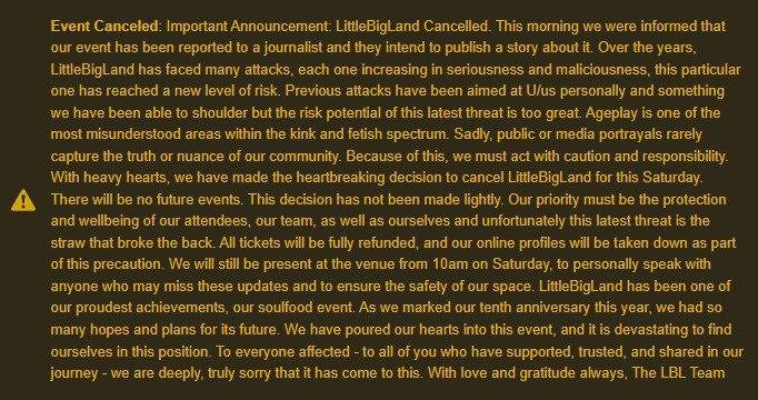 Hi all, just so you know, LBL has been permanently cancelled due to apparently a journalist getting the details of the event, and people who attend. It appears the details have come from Fetlife.